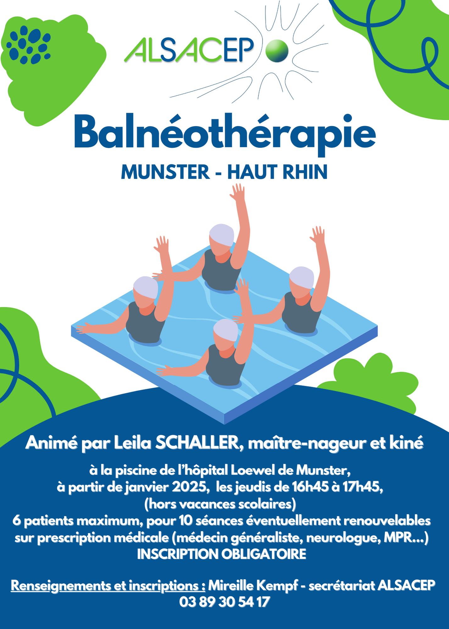 Mme Leila SCHALLER, maître-nageur et kiné à Munster, animera des séances de balnéothérapie (sur prescription médicale), à la piscine de l’hôpital Loewel de Munster, les lundis de 16h05 à 17h00, à partir du 12 janvier 2026. Pour 6 patients maximum, les nouveaux patients seront privilégiés. N'hésitez pas à vous lancer à l'eau avec AlSacEP ! Inscription obligatoire.