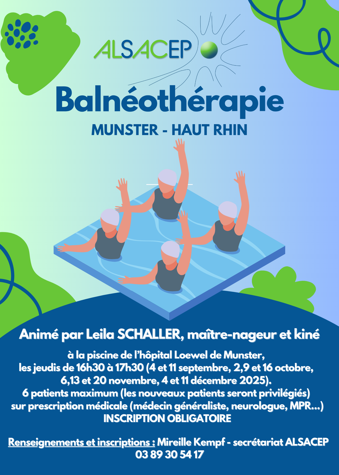 Mme Leila SCHALLER, maître-nageur et kiné à Munster, animera des séances de balnéothérapie (sur prescription médicale), à la piscine de l’hôpital Loewel de Munster, les lundis de 16h05 à 17h00, à partir du 12 janvier 2026. Pour 6 patients maximum, les nouveaux patients seront privilégiés. N'hésitez pas à vous lancer à l'eau avec AlSacEP ! Inscription obligatoire.