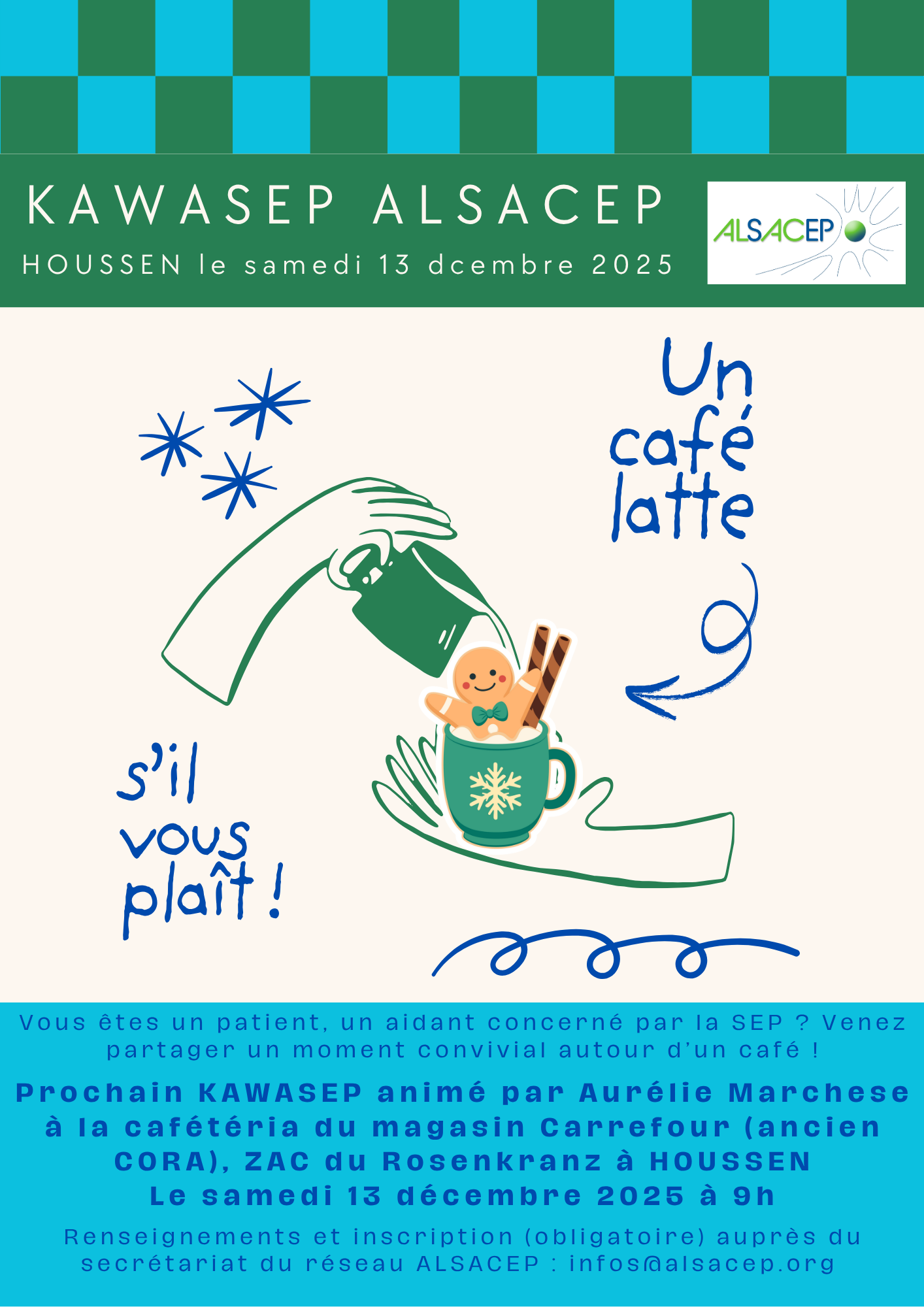 Avis aux patients situés dans le Haut Rhin ! Un KAWASEP aura lieu le samedi 13 décembre 2025 à partir de 9h00 à la cafétéria du magasin CARREFOUR (ancien CORA), ZAC du RosenKranz à HOUSSEN ! Rendez-vous à 9h devant la cafétéria ! Ce KAWASEP sera animé par Aurélie MARCHESE, patiente relais AlSacEP ! Places limitées. Les inscriptions (obligatoires) se font par mail auprès du secrétariat ALSACEP : infos@alsacep.org