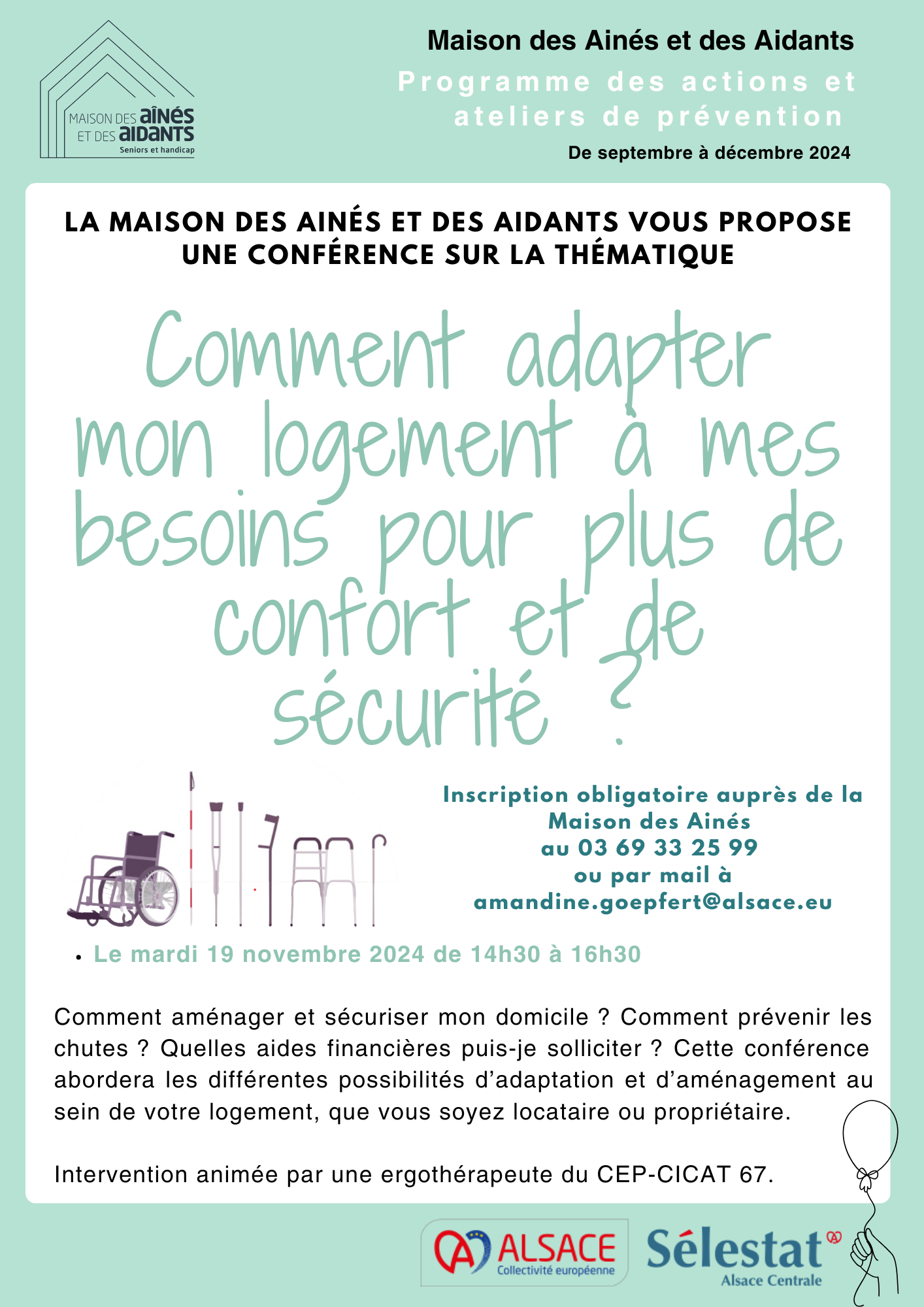Inscription obligatoire auprès de la Maison des Ainés au 03 69 33 25 99 ou par mail à amandine.goepfert@alsace.eu et/ou maud.metzger@ville-selestat.fr