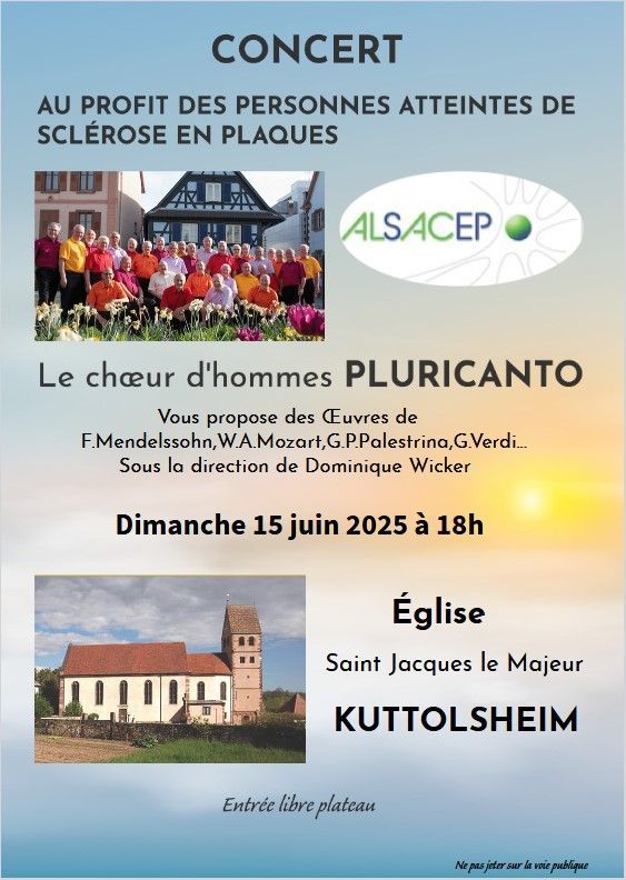 Le choeur d'hommes pluricanto vous donne rendez-vous le dimanche 15 juin à 18h à l'église saint jacques le majeur à kuttolsheim pour un concert donné au profit des personnes atteintes de sclérose en plaques et du réseau alsacep.