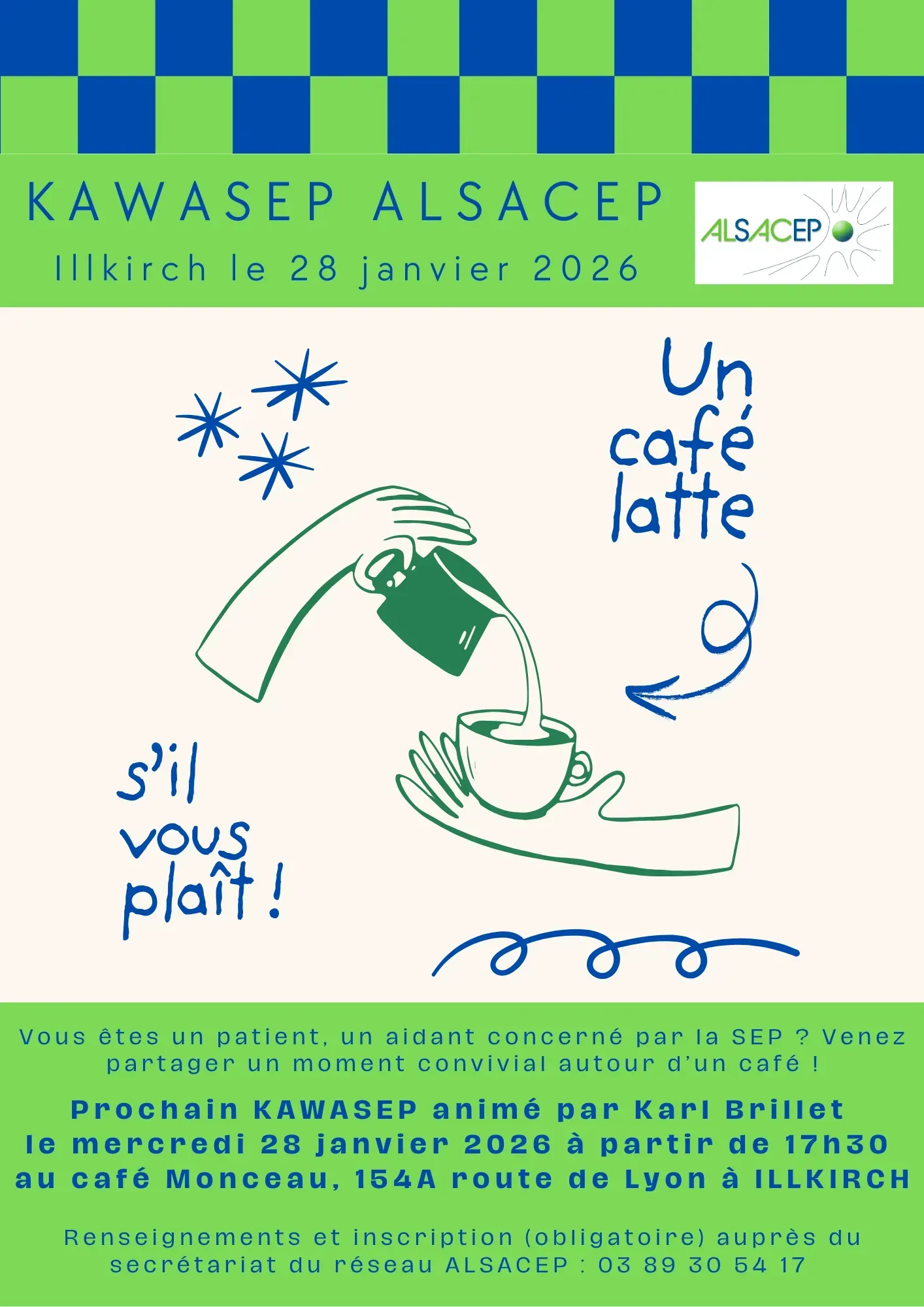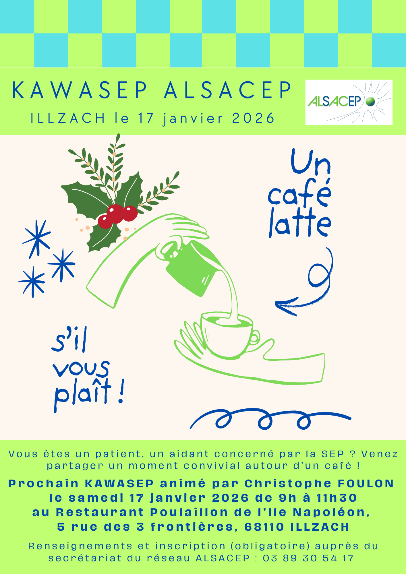 Avis aux patients situés dans le Haut Rhin ! Pour bien commencer l'année, un KAWASEP aura lieu le samedi 17 janvier 2026 de 9h00 à 11h30, au restaurant POULAILLON de l'île NAPOLEON, 5 rue des 3 frontières à ILLZACH (à côté du NOROTAU) ! Ce KAWASEP sera animé par Christophe FOULON, patient relais AlSacEP ! Places limitées. Les inscriptions (obligatoires) se font par mail auprès du secrétariat ALSACEP : infos@alsacep.org ou par téléphone : 03 89 30 54 17