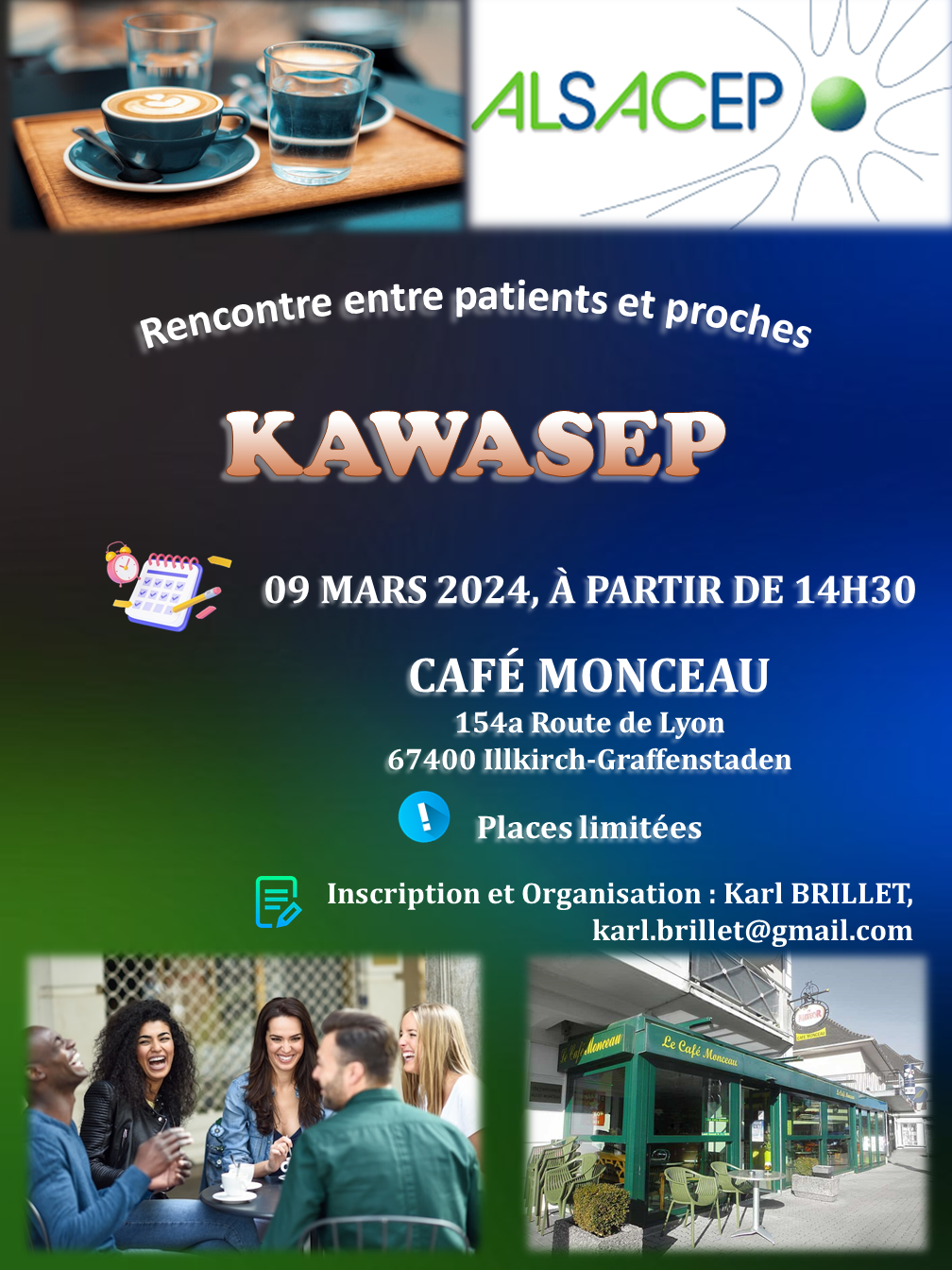 Avis aux patients situés dans le Haut Rhin ! Le prochain KAWASEP aura lieu le samedi 28 mars 2026 à partir de 9h30, à la cafétéria du magasin Carrefour (ancien CORA), ZAC du Rosenkranz à HOUSSEN ! Rendez-vous devant la cafétéria !! Ce KAWASEP sera animé par Aurélie MARCHESE, patiente relais AlSacEP ! Places limitées. Les inscriptions (obligatoires) se font par mail auprès du secrétariat ALSACEP : infos@alsacep.org ou par téléphone : 03 89 30 54 17