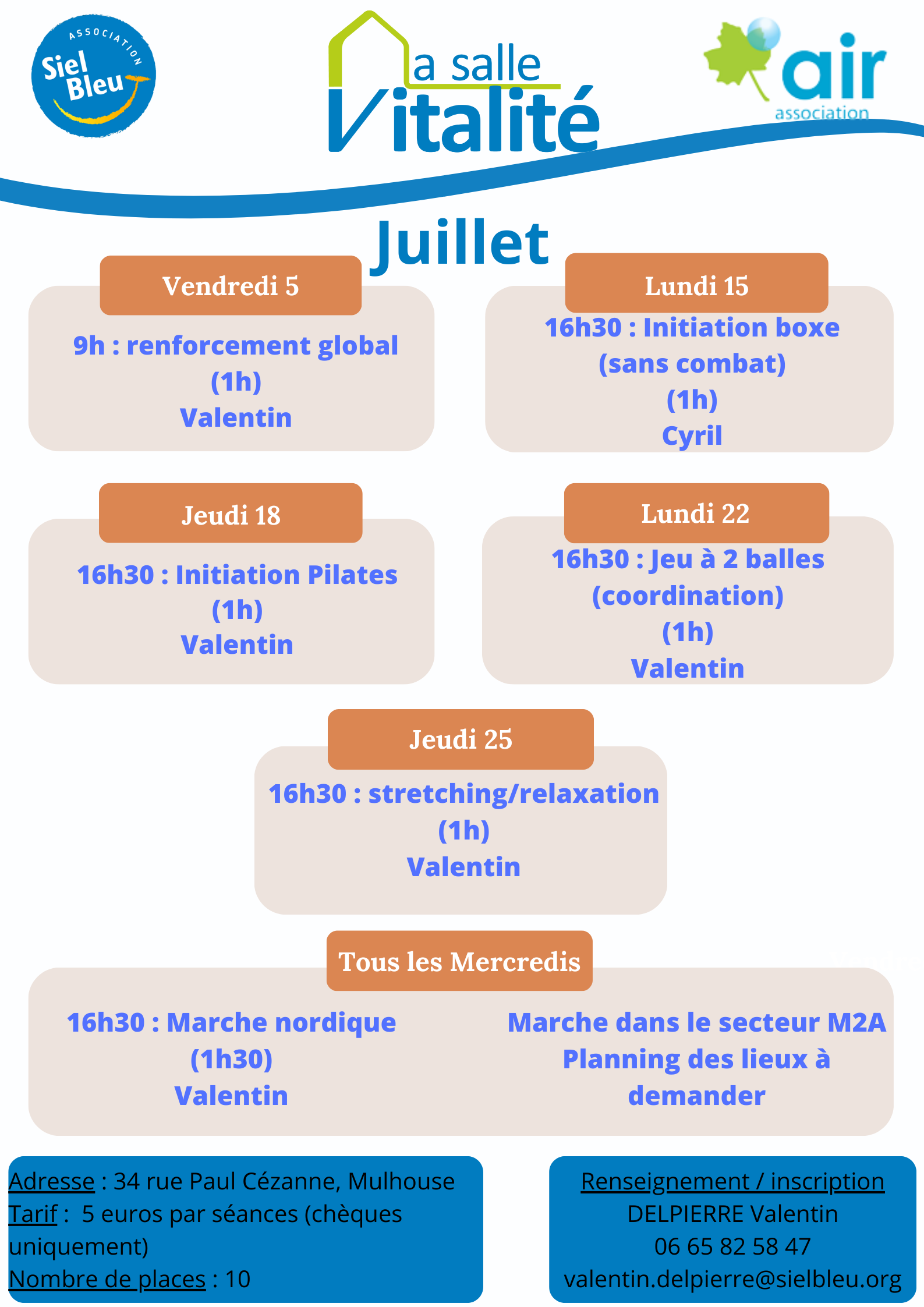 Voici le planning des séances à thème de la salle d’activités physiques adaptées de Siel Bleu concernant le mois de juin.