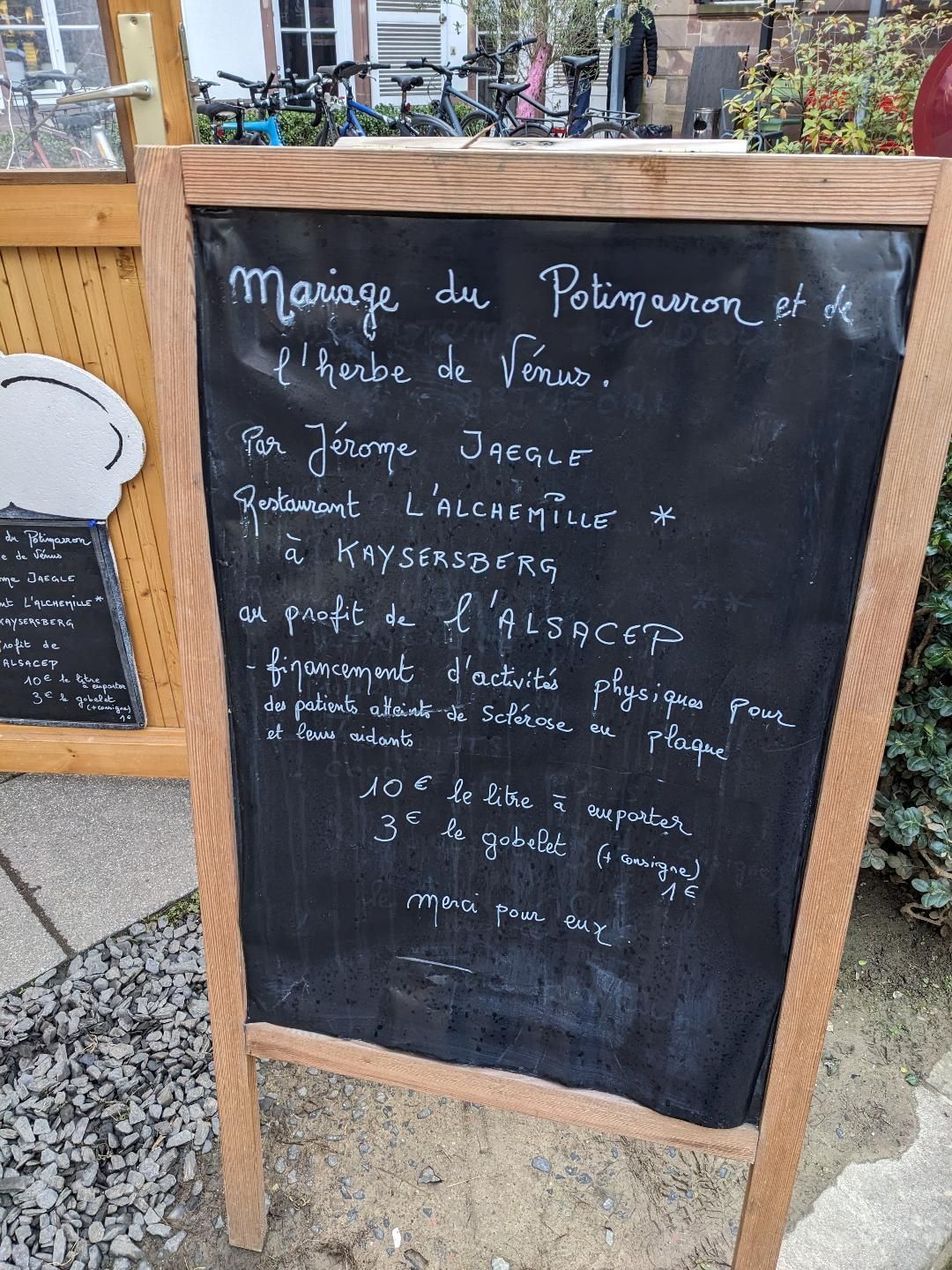 Du 26 novembre au 2 décembre, Jérôme Jaegle, le chef de L’Alchémille à Kaysersberg (* Michelin), a ouvert le bal des soupes en mariant le potimarron et l’herbe de Vénus, pour financer des activités physiques adaptées et des groupes de parole destinés à des patients atteints de sclérose en plaques et à leurs aidants proches (association Alsacep).